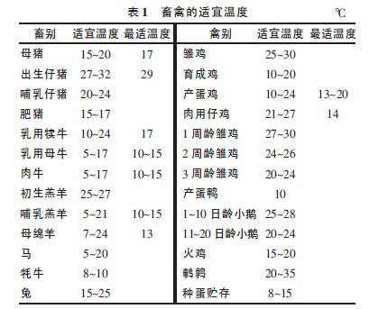 3.1溫度溫度是家畜賴以生存的主要?dú)庀笠蜃又弧<倚篌w溫調(diào)節(jié)的平衡既取決于環(huán)境溫度,又取決于家畜的新陳代謝。因此,家畜、環(huán)境、飼養(yǎng)管理水平三者是相輔相成的。每種畜禽都有一個(gè)適宜的溫度范圍,見表1。