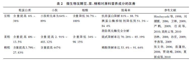 微生物發酵豆、菜、棉粕可以改變飼料原料的物理特性,改善適口性,提高蛋白質含量,降低粗纖維含量,降解抗營養因子和飼料毒素,從而提高動物對飼料的消化利用率(表2)。