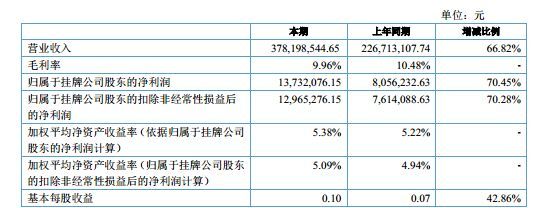 中國(guó)網(wǎng)財(cái)經(jīng)8月29日訊 8月26日,北旺農(nóng)牧發(fā)布2016半年度報(bào)告。報(bào)告 期內(nèi),北旺農(nóng)牧實(shí)現(xiàn)營(yíng)收3.78億元,相較上年同期的2.27億元增長(zhǎng)了 66.82%;歸屬于掛牌公司股東的凈利潤(rùn)為1373.21萬元,相較上年同期 的805.62萬元增長(zhǎng)了70.45%;基本每股收益為0.10元,相較上年同期 的0.07元增長(zhǎng)了42.86%。