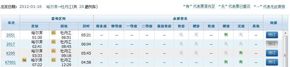 3.下面就要去“搶票”了,點擊左上角日期下面的“車票預定”按鈕,選擇“出發地”,“目的地”用簡拼去填寫,然后用箭頭或者鼠標去選擇對應城市,例如出發地哈爾濱就輸入:heb,然后下箭頭選擇,回車確定即可。選擇好出發日期,最早是可以提前12天預定的,例如5號是可以訂16號的票,6號是可以訂17號的票,以此類推。輸入完成后,點擊“查詢”按鈕,“正在查詢,請稍候!”過后就可以看到車次列表了,以及余票信息,例如下面的: