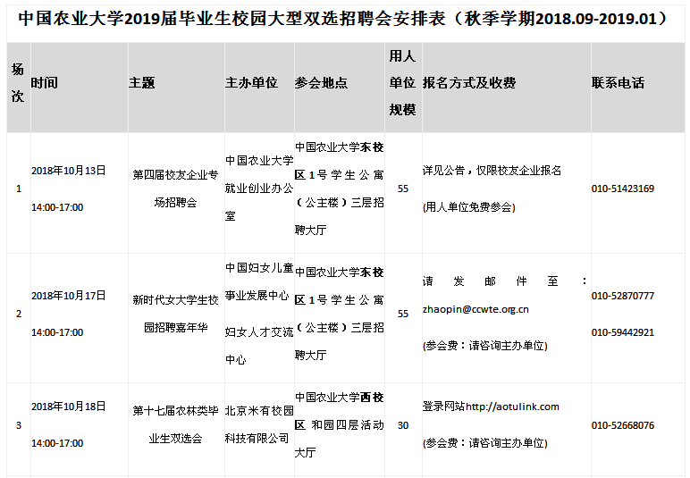 茲定于2018年09月至2019年01月,在我校定期舉辦多場2019屆畢業生校園雙選招聘會、并可接待企業舉行專場宣講招聘會,在此誠摯邀請各用人單位到中國農業大學招賢納才,我們將加大精準推送和宣傳力度,組織2019屆本、碩、博畢業生參加每場招聘會。